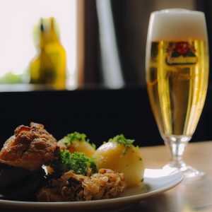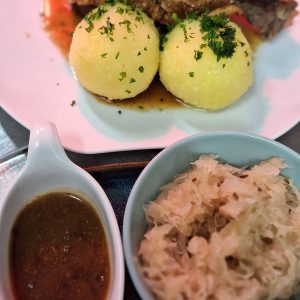 Auf Dunkelbiersoße, dazu Klöße und Sauerkraut |