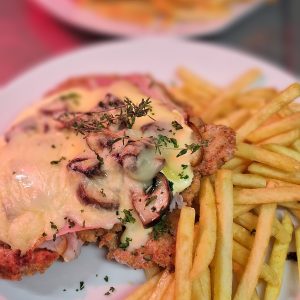 Paniertes Schweineschnitzel mit Paprika-Zwiebel-Tomaten-Soße und Käse überbacken, dazu Pommes und Salat |