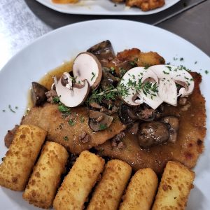 Paniertes Schweineschnitzel an Champignon-Speck-Soße, dazu Kroketten und Salat |