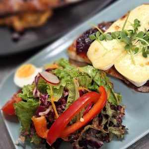 Putensteak mit Preiselbeeren und Camembert überbacken, dazu Rösti und Salat |